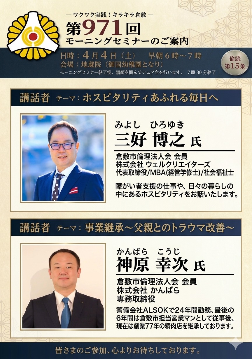 経営者モーニングセミナー 【2026年4月4日】第971回経営者モーニングセミナー Post Share Hatena Line note 経営者モーニングセミナー コメント: 0 【2026年3月28日】第970回経営者モーニングセミナー 前の記事 【2026年4月11日】第972回経営者モーニングセミナー 次の記事